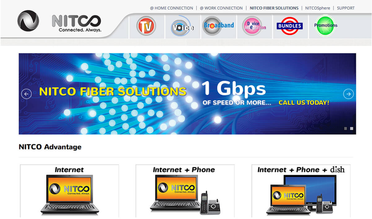 Solution: Devarj Design Agency Rebranded the company by creating and incorporating the infinity symbol and global concept into the logo, adding to it the tagline "Connected. Always." to reassure the audience that NITCO is here to stay offering extraordinary new products and services with potential global reach, Devarj's Creative house also developed new branded names and a specific identity for services including "nitcosphere, voice, bundles broadband, device integration, TV." Additionally, the team created the new taglines - "Infinitely friendlier" and "Connected Always." Through Devarj's branding and marketing efforts, the updated website originated 790 new hits during the introductory week. Now, the NITCO.com team is able to market and sell NITCO products and services while maintaining a memorable and timeless brand. Devarj won a national award of excellence in re-branding and marketing NITCO.